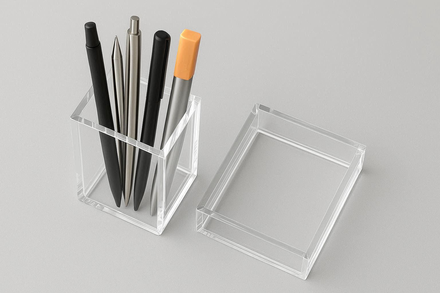 This sleek set includes two clear acrylic pen cups, offering a minimalist and modern look that suits any contemporary desk. Made from high quality, transparent acrylic, they provide a clean, unobtrusive way to organize writing instruments and small tools. The seamless design and crystal clear material create a light, airy aesthetic that makes your desk appear more spacious and tidy.