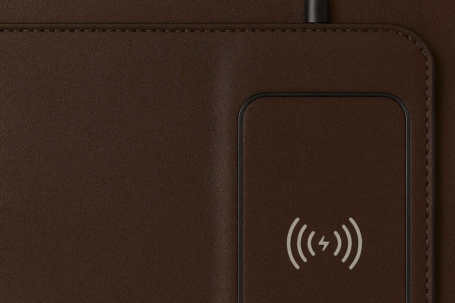 Integrate cutting edge technology into your desk with this PU leather desk pad featuring a built in Qi wireless charging spot. The seamless leather surface provides a sleek, professional look and a comfortable area for writing and mouse use. The designated charging area, marked subtly on the pad, allows you to charge compatible smartphones by simply placing them down, reducing cable clutter.
