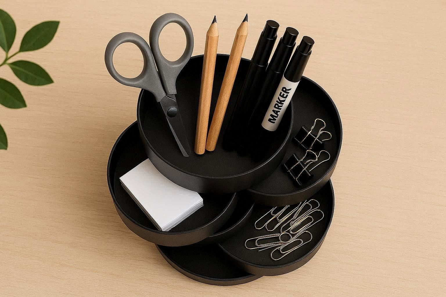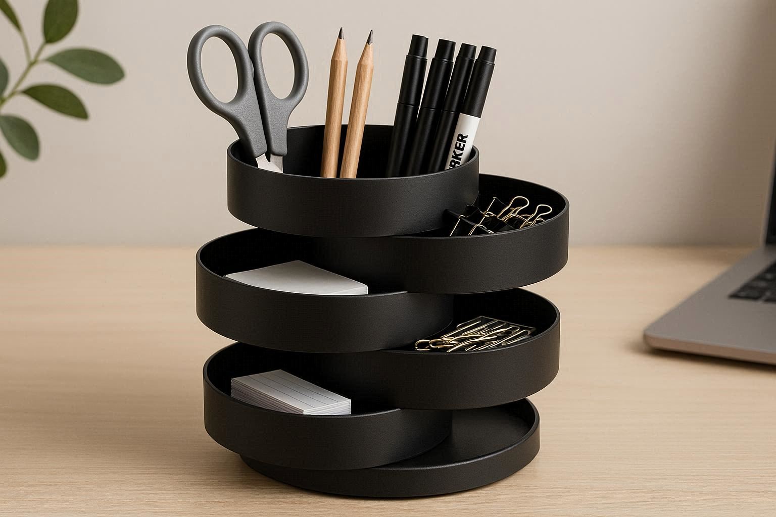 Optimize your desk space with this innovative rotating organizer featuring multiple tiers of storage compartments. The central pole allows the entire unit to spin 360 degrees, providing easy access to all sides without needing to move it. The tiers include various sized slots, drawers, and open bins to accommodate everything from pens and paper clips to tape rolls and smartphones.